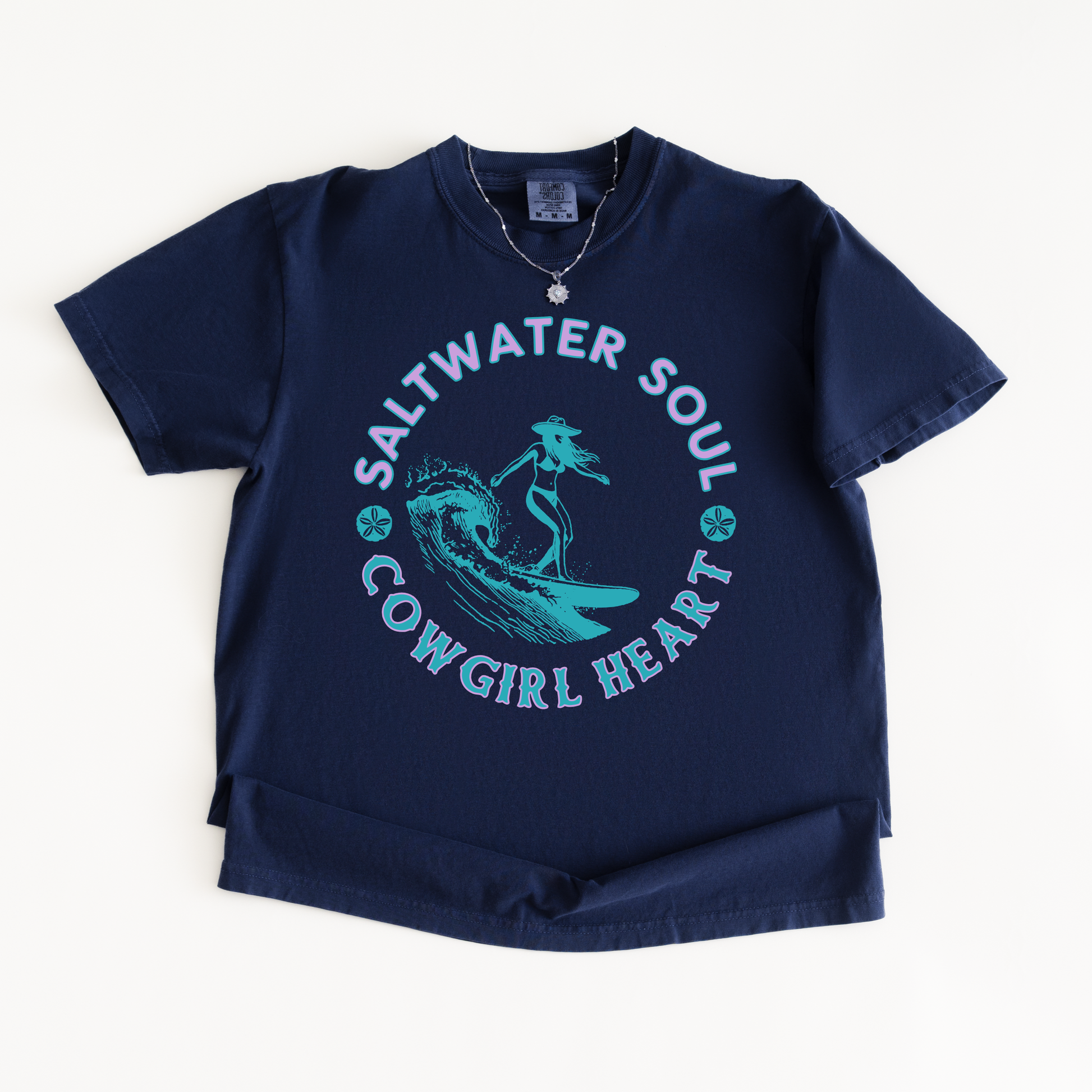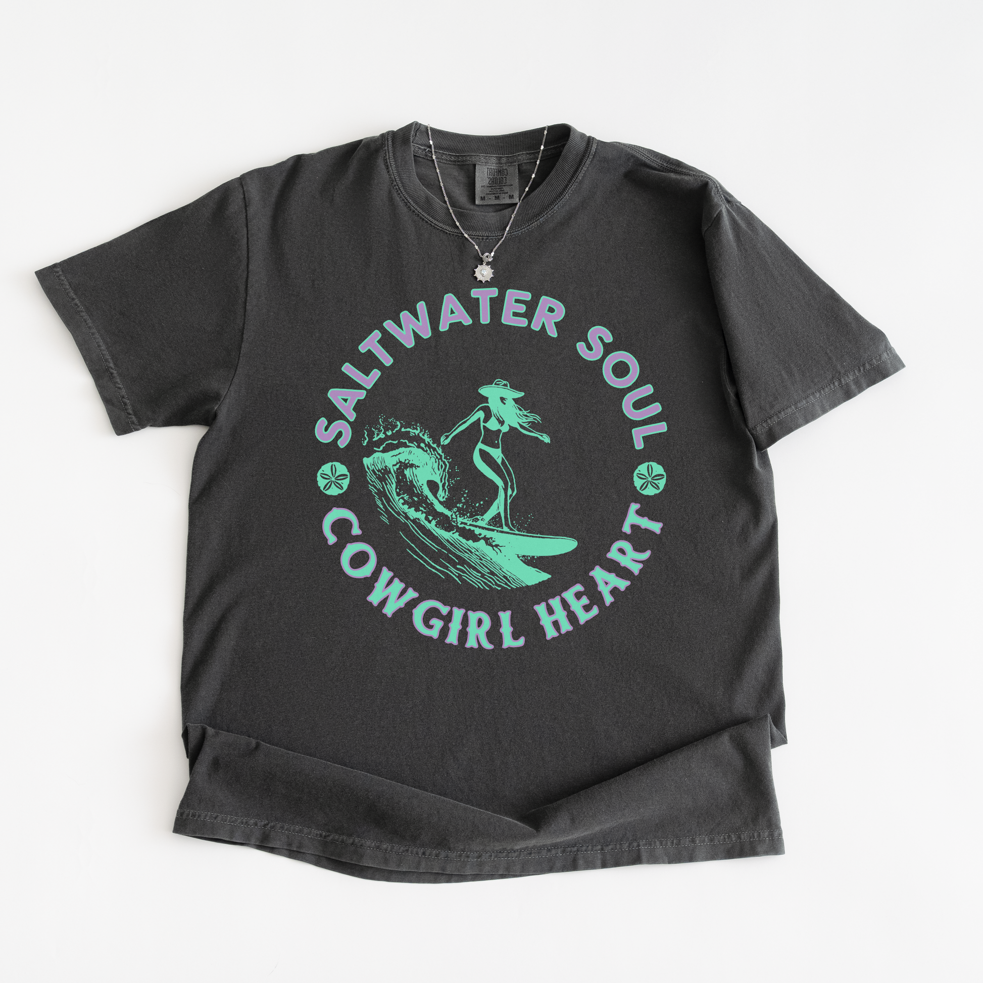 This "Saltwater Soul, Cowgirl Heart" tee is for the woman who shows up to the beach in cowboy boots and doesn't think twice about it. She surfs, she rides, she does both — and she looks good doing it.